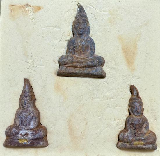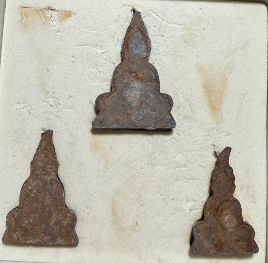 พระท่ากระดานวัดต้นลำใย จ.กาญจนบุรี เนื้อตะกั่วสนิมแดงกรุศรีสวัสดิ์ สภาพสวยพร้อมกล่องเดิมครบชุด 3 พิมพ์ พระเหมาบ้านมาลงวัดใจค่ะ