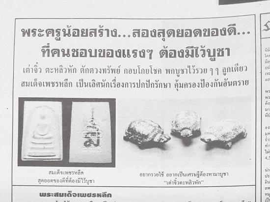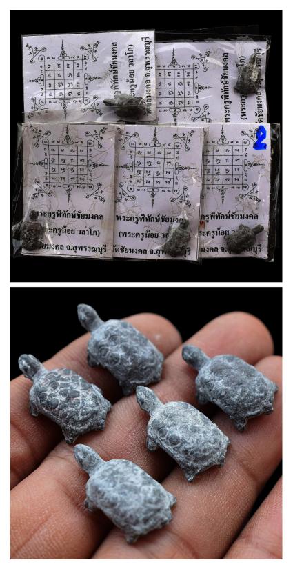 สุดยอดเครื่องรางศาสตร์แห่งความเจริญก้าวหน้า เจริญรุ่งเรืองเงินทอง เจริญด้วยทรัพย์สินอันมากค่า พญาเต่านี้นับเป็นเครื่องรางที่เก่าแก่ และเป็นที่นิยมกันอย่างมาก เป็นอีกหนึ่งจากตำนานพระเจ้า 500 ชาติ ที่ทรงบำเพ็ญเพียรสร้างบุญบารมี เต่าจิ๋วที่พระครูน้อยสร้างนี้ ถือเป็นอีกหนึ่งเครื่องรางแห่งความสำเร็จ สมหวังดังใจเรื่องเงินๆทองๆ เรื่องทำมาหากิน ไม่ว่าท่านจะกระทำการค้าฝืดเคืองถึงเพียงไหน หากมีเต่าจิ๋วไว้บูชาแล้วล่ะก็ ทรัพย์สินเงินทองก็จักมากองอยู่ตรงหน้าอย่างไม่ช้านาน ไม่ว่าท่านจะกระทำธุรกิจการงานอันใดใด หวังได้ยอด หวังทำให้ได้ตามเป้า ให้เอาเต่าจิ๋วนี้ไปไว้ใช้บูชา การเงินการทองหลั่งไหลท้วมท้นเข้ามาหา มีโชค บังเกิดลาภเข้ามาได้ว่องไวทันตาเห็น พระครูน้อยได้สร้างเต่าจิ๋วนี้จากเนื้อชินตะกั่วสนิมแดง ที่ได้มาจากถ้ำในเมืองกาญจนบุรี ถือเป็นแร่อาถรรพณ์ที่มีดีอยู่ในตัว อีกทั้งยังได้ซัดผสมปรอทเข้าไปขณะเทหล่อ ปลุกเสกอยู่นานเป็นปีๆกว่าจะนำออกมาให้บูชากัน