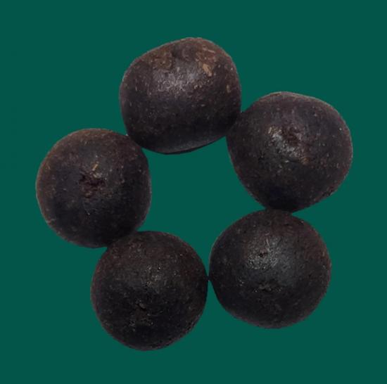 เม็ดยาเนื้อเข้มแก่มวลสาร ขนาดลูกประมาณ 0.8 ซม. |