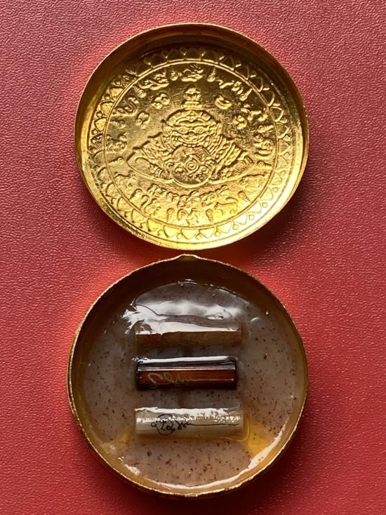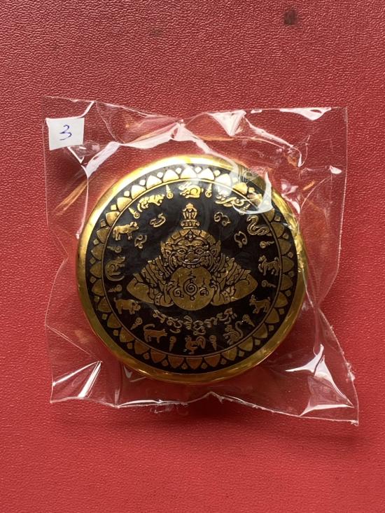 เคาะเดียวแดง สีผึ้งพระราหู รุ่น มงคลจักรวาล เนื้อ โลหะชุบทองลงยาสีดำขอบสีดำ ขนาด 5ซม