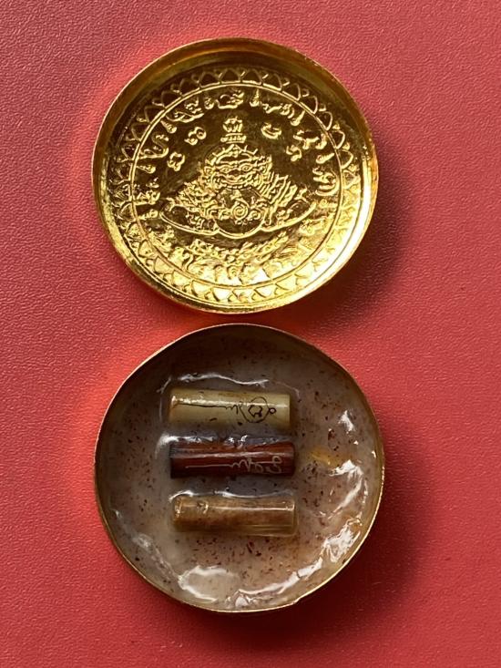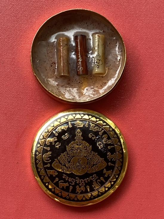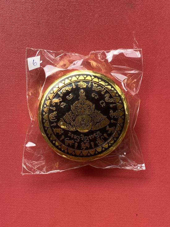 เคาะเดียวแดง สีผึ้งพระราหู รุ่น มงคลจักรวาล เนื้อ โลหะชุบทองลงยาสีดำขอบสีดำ ขนาด 5ซม