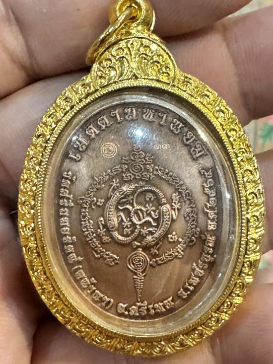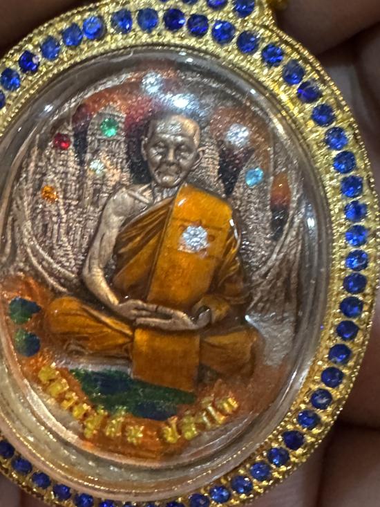 เหรียญหลวงปู่ฝั้น วัดศรีลมอรัตย์ เพชรบูรณ์ รุ่นเมตตามหานิยม เนื้อทองแดงซาตินจีวรส้ม ฝังพลอย เพ้นท์ลาย กรอบชุบทอง หมายเลข 13 สร้าง 35 เหรียญ
