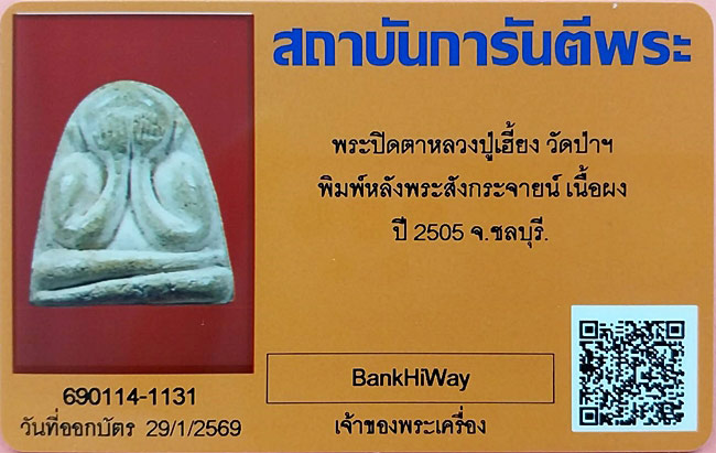 รายละเอียด พระปิดตาหลวงปู่เฮี้ยง วัดป่าฯ พิมพ์หลังพระสังกัจจายน์ พ.ศ.2505