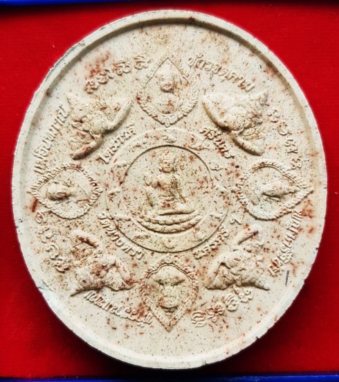 ลักษณะเป็นรูปทรงกลมขนาด 5 ซม. กึ่งกลางเป็นองค์พระพุทธเจ้าประทับนั่งปางมารวิชัยบนฐานบัวในซุ้มเรือนแก้วด้านข้างซ้ายขวาเป็นรูปสถูปเจดีย์ ด้านหลังกึ่งกลางเป็นพระพิมพ์ซุ้มประตูกรุวัดนางตรา