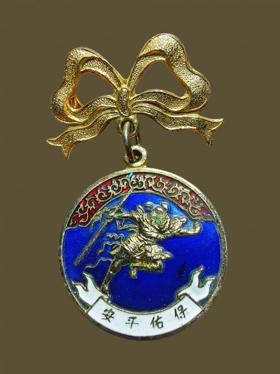 เหรียญเข็มกลัดองค์ไต้เสี่ยฮุกโจ้วถนนตากสินสำเหร่เทียนง้วนตึ้งซอยวัดสุทธารามจ.กรุงเทพปีพ.ศ.2525เนื้อกะไหล่ท องลงยามีโบว์รุ่นกรรมการ |