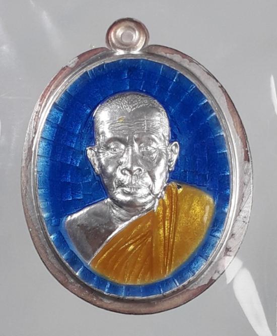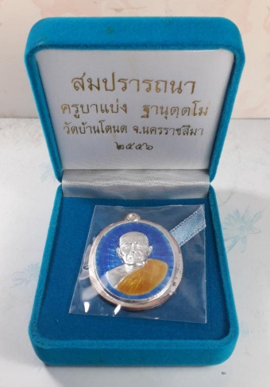 เหรียญสมปรารถนา ครูบาแบ่ง วัดบ้านโตนด จ.นครราชสีมา ปี2556 เนื้อเงินลงยาสีฟ้าจีวรเหลือง หลังเรียบมีปีก,จาร,โค๊ตและหมายเลข แยกจากชุดกรรมการ พร้อมกล่องกำมะหยี่เดิม