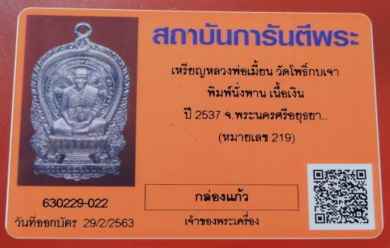 เหรียญนั่งพานหลวงพ่อเมี้ยน วัดโพธิ์กบเจา ปี 2537 เนื้อเงิน