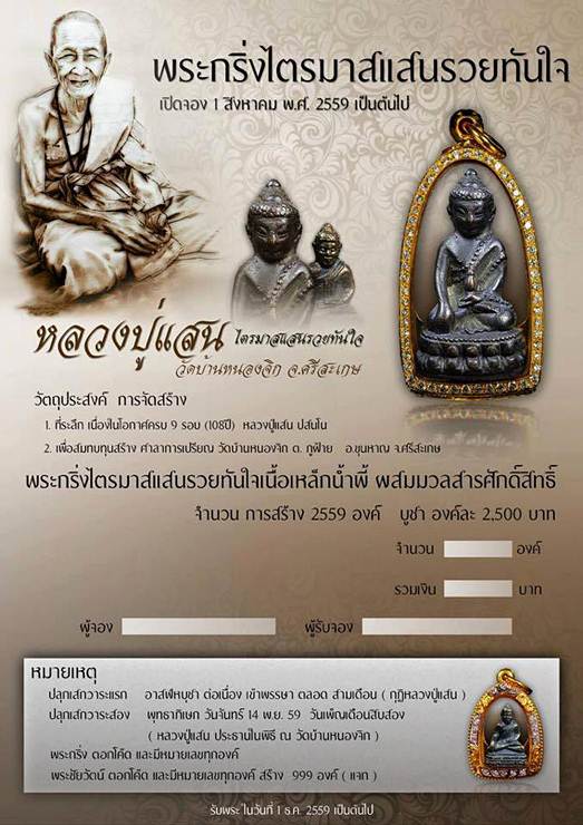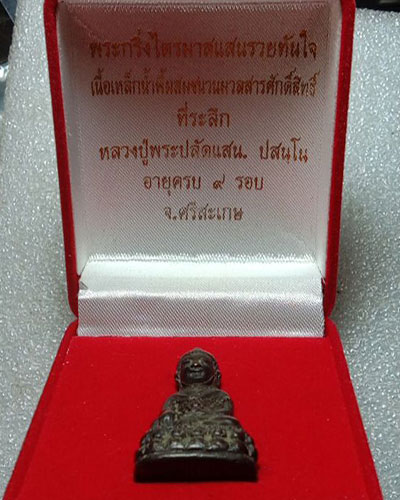 พระกริ่งไตรมาสแสนรวยทันใจ เนื้อเหล็กน้ำพี้(จัดสร้างเพียงเนื้อเดียวเท่านั้น) หลวงปู่แสน วัดบ้านหนองจิก จ.ศรีสะเกษ ปี ๕๙ หมายเลข ๑๗๐๘ กล่องเดิม |