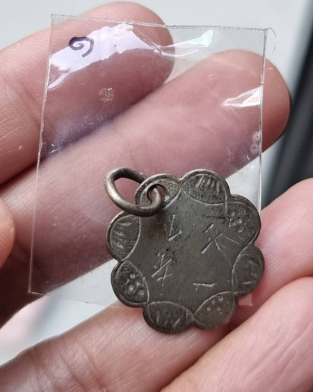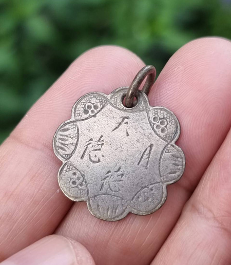 No.2 เหรียญจีน ดอกเหมย อักษรจีนอยู่ตรงกลาง เนื้อเงิน ห่วงเชื่อม ของจีนโบราณ หรือเหรียญหยินหยาง ซึ่งเป็นเครื่องรางจีนโบราณที่นิยมใช้เพื่อเสริมสิริมงคล
