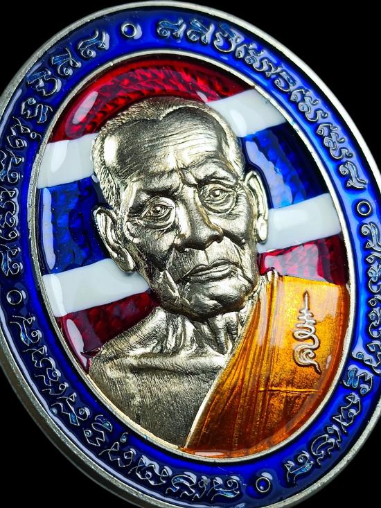 เริ่ม 100.- *** เหรียญ 5 แชะ2 หลวงพ่อพัฒน์ วัดห้วยด้วน เนื้ออัลปาก้าลงยาธงชาติ ขอบน้ำเงิน ลงยาจีวร