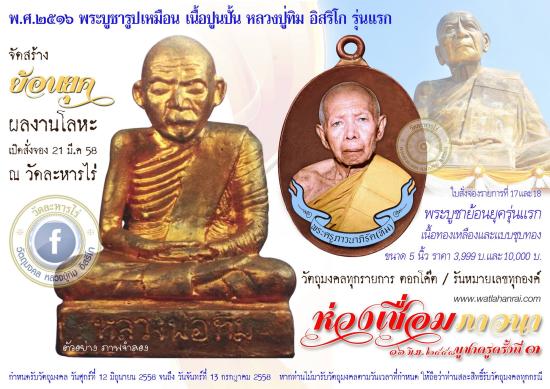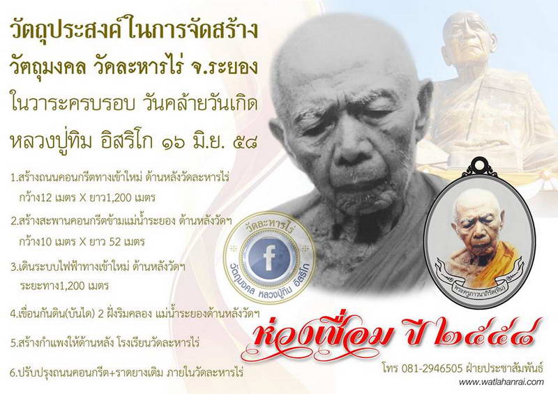 จัดสร้างโดย วัดละหารไร่ วัตถุประสงค์ดี แกะทรงพิมพ์ได้สวยมาก เหมือนหลวงปู่ทิมมาก และมีชนวนมวลสารเก่าที่หลวงปู่ทิม ปลุกเสกไว้ แถมปลุกเสก โดยพระเกจิอาจารย์ชื่อดัง และพระเกจิอาจารย์สายหลวงปู่ทิมจำนวนมาก พิธีใหญ่ปลุกเสกโบสถ์ วัดละหารไร่ |