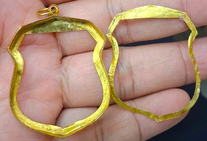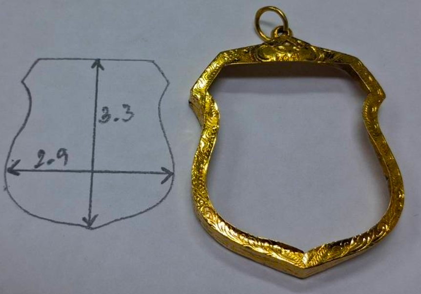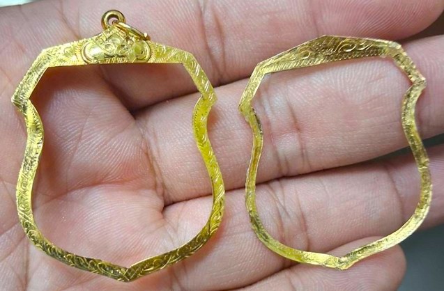กรอบทองมือสอง ใส่เหรียญพระนารายณ์ทรงครุฑ หลวงปู่หมุน หรืออื่นๆที่ไกล้เคียง หน้าจอกว้าง 2.90 ซม., สูง 3.30 ซม. น้ำหนัก 1.85 กรัม เคาะเดียว