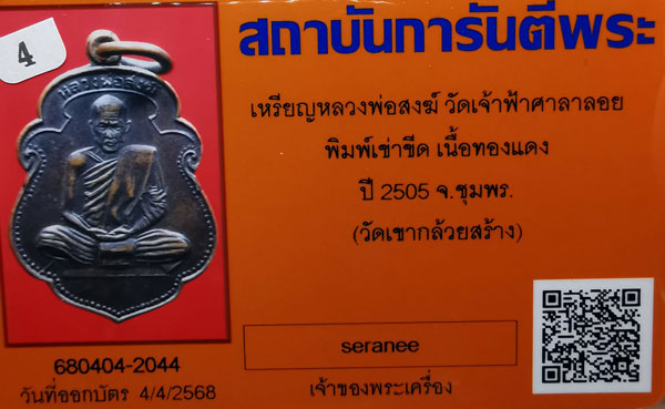 เหรียญรุ่นแรก หลวงพ่อสงฆ์ วัดเจ้าฟ้าศาลาลอย พิมพ์เข่าขีด เนื้อทองแดง ห่วงเดิม ปี2505 จ.ชุมพร(วัดเขากล้วยสร้าง)+ บัตรG-pra สภาพเดิมค่ะ |