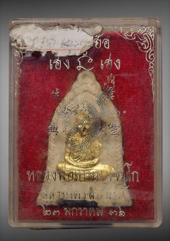 พระผงรูปเหมือนทรงระฆัง เซ็งลี้ฮ้อ หลวงพ่อเกษม เขมโก สุสานไตรลักษณ์ จ.ลำปาง ปี 36..ฝังตะกรุดเงิน+จีวร+องค์ปิดตา |