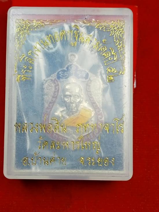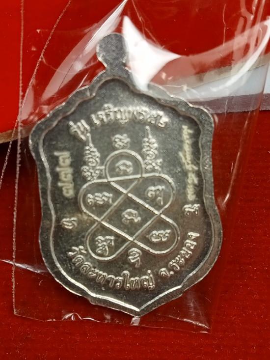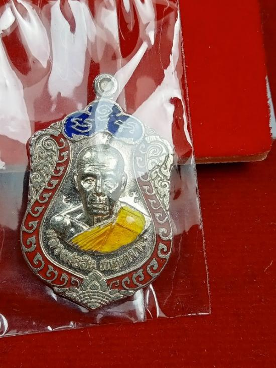 เหรียญเสมาเล็ก รุ่นแรก หลวงพ่อสิน วัดละหารใหญ่ เนื้อเงินลงยา 3 สี สีแดง( มี 4 สี สร้างสีละ 2500 เหรียญ ) หมายเลขสวย 777 สร้างน้อย แค่ 2500 เหรียญ ปี 2552 พร้อมกล่องเดิมจากวัด