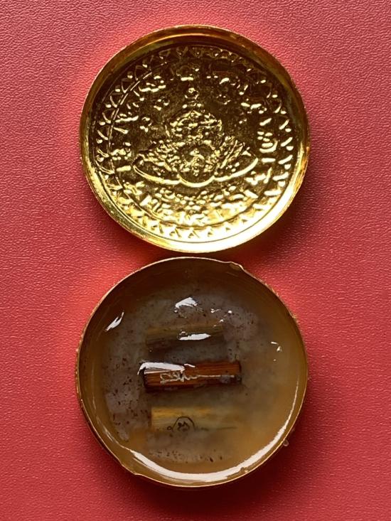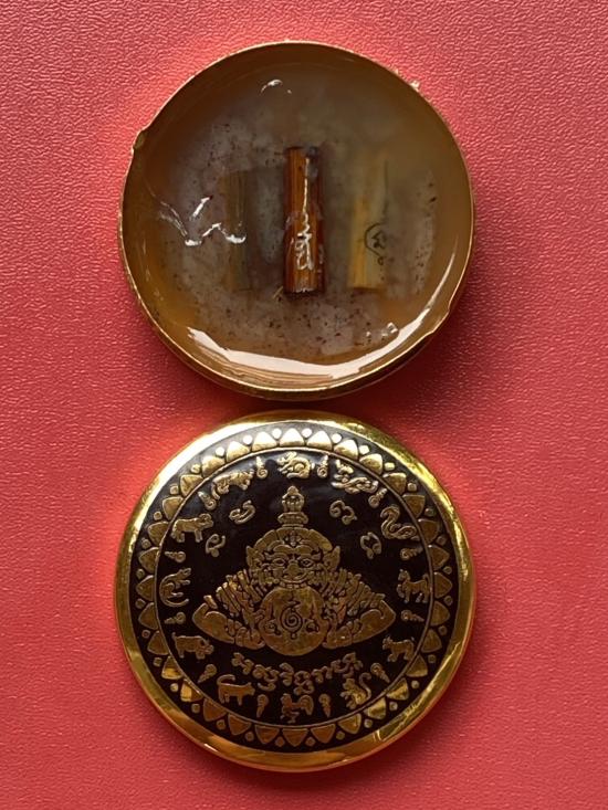 เคาะเดียวแดง สีผึ้งพระราหู รุ่น มงคลจักรวาล เนื้อ โลหะชุบทองลงยาสีดำขอบสีดำ ขนาด 5ซม