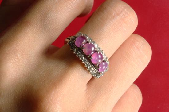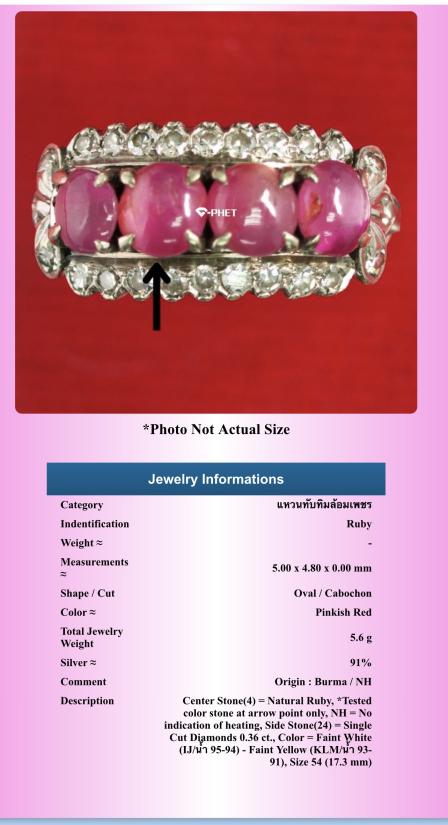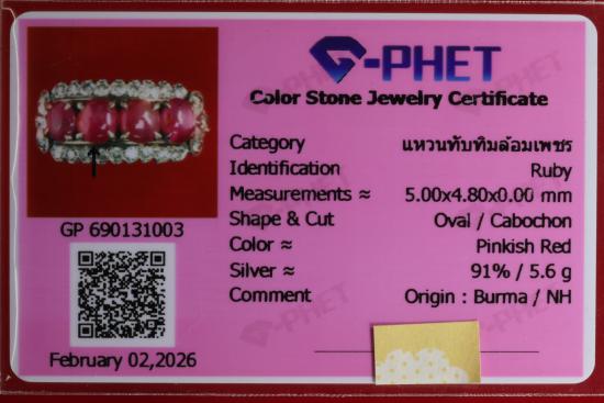 แหวนทับทิมล้อมเพชร ตัวเรือนเงิน 91% น้ำหนักรวม 5.6 กรัม พร้อมบัตรรับรองฯ