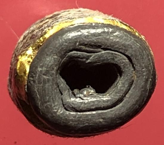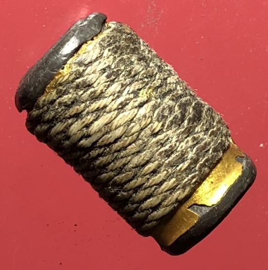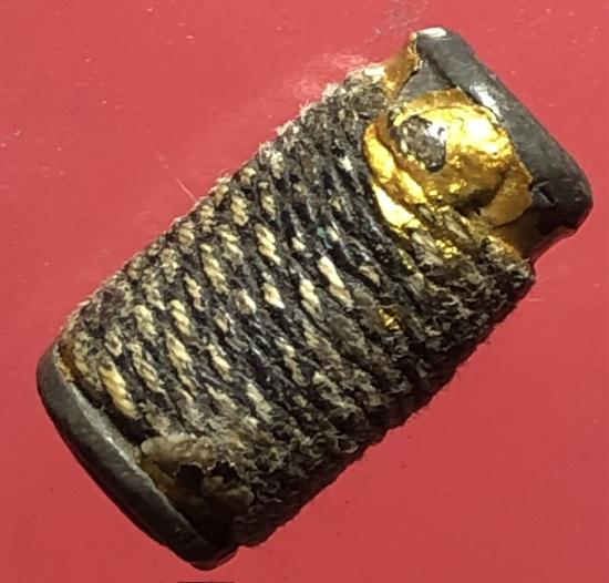 ตะกรุดนิ้วเนื้อตะกั่วเก่าถักเชือกลงรักเก่าไม่ทราบที่ ขนาดความยาว 1.0 นิ้ว |