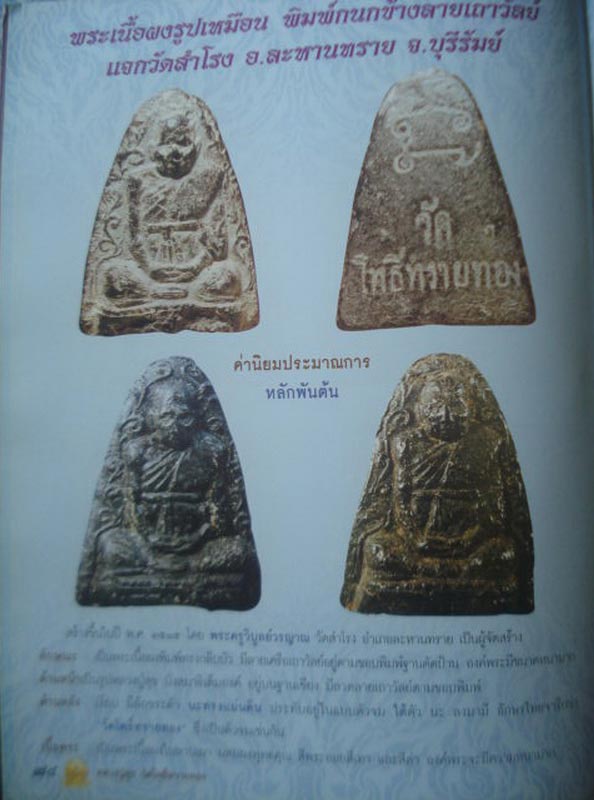 พระผงรูปเหมือนพิมพ์กนกข้างลายเถาวัลย์ หลวงปู่สุข ธมุมโชโต เทพเจ้าแห่ง วัดโพธิ์ทรายทอง อ.ละหานทราย จ.บุรีรัมย์ จัดเป็พระผงรุ่นสุดท้าย ของ หลวงปู่สุข วัดโพธิ์ทรายทอง ที่ดำเนินการจัดสร้างโดย ท่านพระครูวิบูลย์วรญาณ วัดสำโรง ในปี พ.ศ.๒๕๑๕ ถวายหลวงปู่สุข อธิษฐานจิตปลุกเสกเดี่ยว ก่อนหลวงปู่สุข ท่านจะมรณะภาพในช่วงปลายปี (เดือนธันวาคม )ของปีเดียวกัน องค์พระมีขนาดใหญ่ เขื่องพอสมควร ด้านหน้าเป็นรูปหลวงปู่สุข นั่งสมาธิเต็มองค์ อยู่บนฐานเขียง ในพิมพ์ทรงกลีบบัว มีลายเครือเถาวัลย์อยู่รอบองค์ หลวงปู่สุข ท่านทำให้ดูสวยงาม มีเอกลักษ์ เฉพาะตัว ด้านหลัง มีอักขระ นะทรงแผ่นดิน ที่ด้านบน และ ด้านล่างจารึกว่า วัดโพธิ์ทรายทอง จัดสร้างจากเนื้อผงพุทธคุณผสมผงใบลานเผา โดยเนื้อพระจะออกเป็นโทนสีเทา และ สีดำ เป็นพระผงรูปเหมือนรุ่นสุดท้าย หลวงปู่สุข วัดโพธิ์ทรายทอง ที่พบเจอไม่บ่อยครั้งนัก หายากมากๆ |