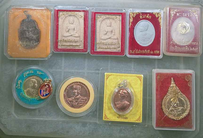 พระเจ้าตากสินมหาราช 4 องค์ + ร.5 3 องค์ + พระผงร.6 +เหรียญร.9 + เช็มกลัดพระเทพ |