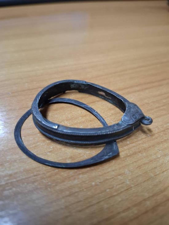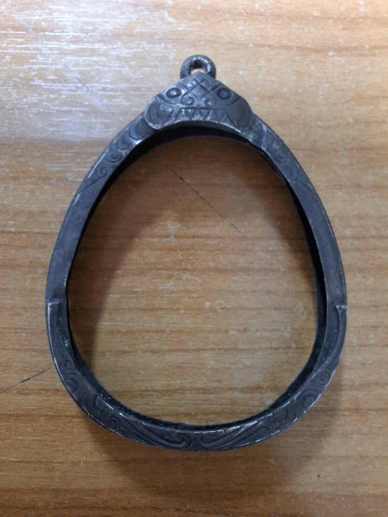 กรอบเงินเก่า ยกซุ้ม ขอบเกลียว เคยใส่ปิดตาจัมโบ้ ขอบใน กว้างสุด 3.4 cm. สูง 4 cm. |
