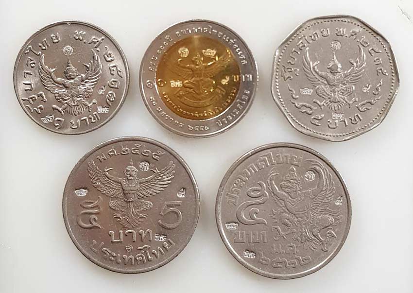 (1มีชุด5เหรียญ) 1.ครุฑมหาบพิตร 2.ครุฑตรง100ปี ธ.ไทยพาณิชย์ 3.ครุฑ9เหลี่ยม 4.ครุฑหน้าตรง 5.ครุฑเฉียงเฉียง{เหรียญเนื้อนิเกิล เลข 9 }