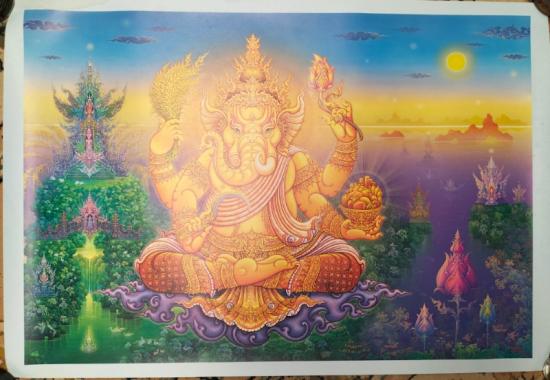 ภาพพิมพ์กระดาษพระพิฆเนศพร้อมลายเซ็นสดขนาด 69 *99 ซม มีคราบบางๆที่ขอบรูป |