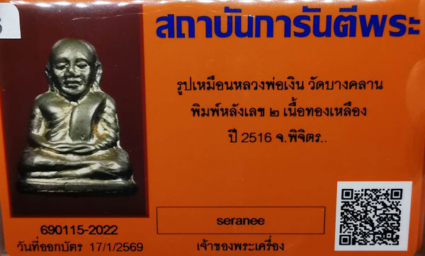 รูปเหมือนหลวงพ่อเงิน วัดบางคลาน พิมพ์หลังเลข๒ เนื้อทองเหลือง ปี2516 จ.พิจิตร + บัตรG-pra สภาพเดิมค่ะ |