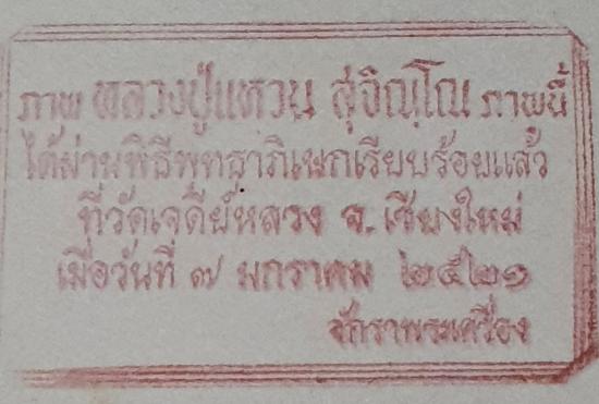 ภาพหลวงปู่แหวน สุจิณโณ ภาพนี้ได้ผ่านพิธีพุทธาภิเษกเรียบร้อยแล้ว ที่วัดเจดีย์หลวง จ.เชียงใหม่ เมื่อวันที่ 7 มกราคม ปี2521(ขนาด 5*7 นิ้ว ด้านหลังปั๊มหมึกแดง สภาพสวย) แท้ทันหลวงปู่สภาพใหม่เก่าเก็บ