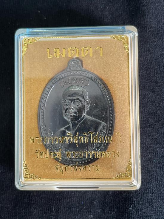 !!!ต่ำกว่าราคาจอง!!!เหรียญเมตตา พระภวานาวิสุทธิโสภฯ วิ. วัดประดู่ จังหวัดสมุทรสงคราม เนื้อทองแดงรมดำ หมายเลข 7627 พร้อมกล่อง |