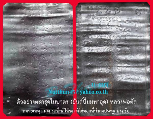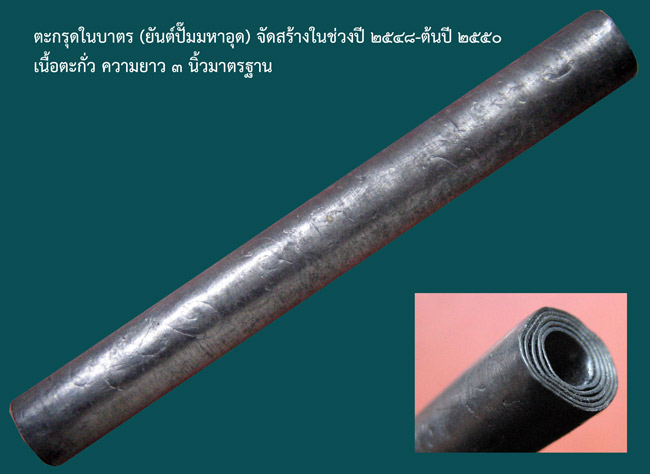 ตะกรุดในบาตร (ยันต์ปั๊มมหาอุด) เนื้อตะกั่ว ความยาว ๓ นิ้วมาตรฐาน จัดสร้างในช่วงปี ๒๕๔๘-ต้นปี ๒๕๕๐ สุดยอดตะกรุดที่มีประสบการณ์มากมาย อีกหนึ่งวัตถุมงคลของ หลวงพ่อตัด วัดชายนา ใครก็ตามที่เคยไปกราบหลวงพ่อตัด เมื่อร่วมทำบุญก็จะได้ตะกรุดมหาอุด ที่หลวงพ่อหยิบมาแจกให้จากในบาตรของหลวงพ่อ คนละดอกสองดอก ผู้ที่ได้ก็นำไปใช้ จนมีประสบการณ์เล่าขานกันต่างๆนาๆ ลูกศิษย์ลูกหาก็มักเรียกตะกรุดที่หลวงพ่อแจกจนติดปากว่า "ตะกรุดในบาตร" สภาพสวยๆ ไม่ผ่านการใช้ รับประกันความแท้ ได้มาจากวัดโดยตรง ศึกษาความแท้และยันต์ในตะกรุดได้จากภาพตัวอย่าง ใครกำลังมองหาอยู่เชิญครับ ช้าหมดราคาเบาๆจะไม่มีนะครับ