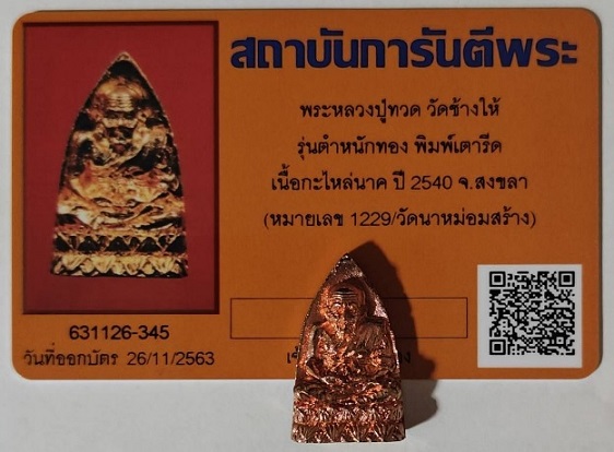 หลวงปู่ทวด รุ่นตำหนักทอง หลวงปู่ทอง สุสังวโร วัดป่ากอสุวรรณาราม อ.นาหม่อม จ.สงขลา ปี 2540 เตารีดกะไหล่นาก ตอกโค๊ด ตอกหมายเลข ๑๒๒๙ |