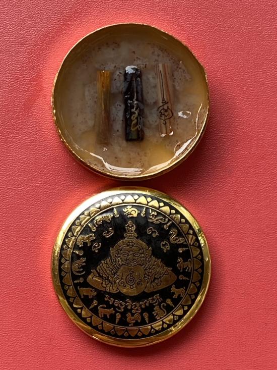 เคาะเดียวแดง สีผึ้งพระราหู รุ่น มงคลจักรวาล เนื้อ โลหะชุบทองลงยาสีดำขอบสีดำ ขนาด 5ซม |