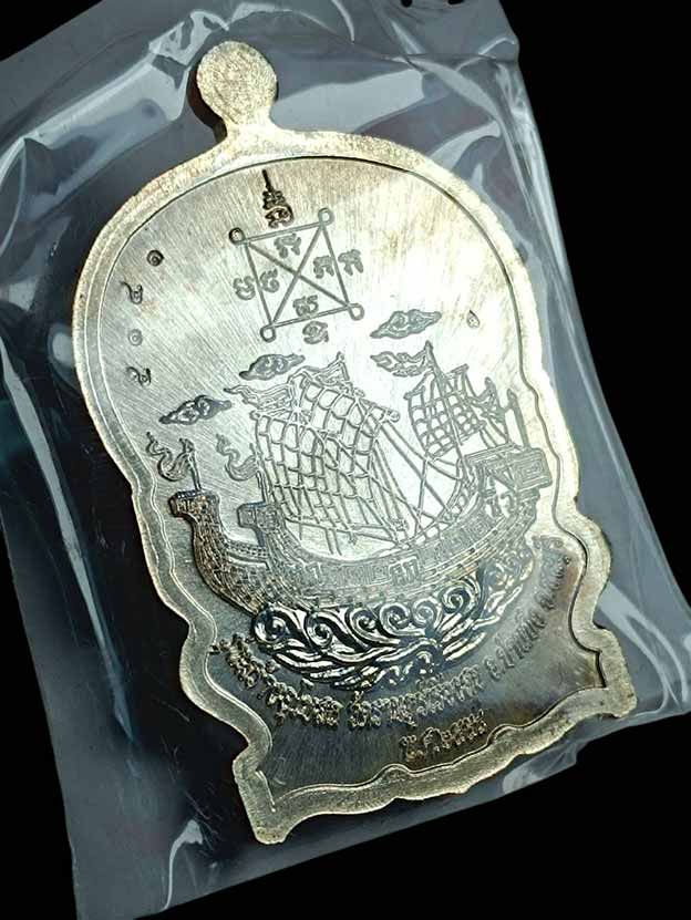 เหรียญนั่งพานสำเภาทอง หลวงปู่ฮก วัดราษฏร์เรืองสุข จ.ชลบุรี ปี พ.ศ.2558 เนื้ออาบเงิน ลงยาสี ตอกโค้ต หมายเลข 5141 ซีลเดิม พร้อมกล่อง ผิวสวยๆ |