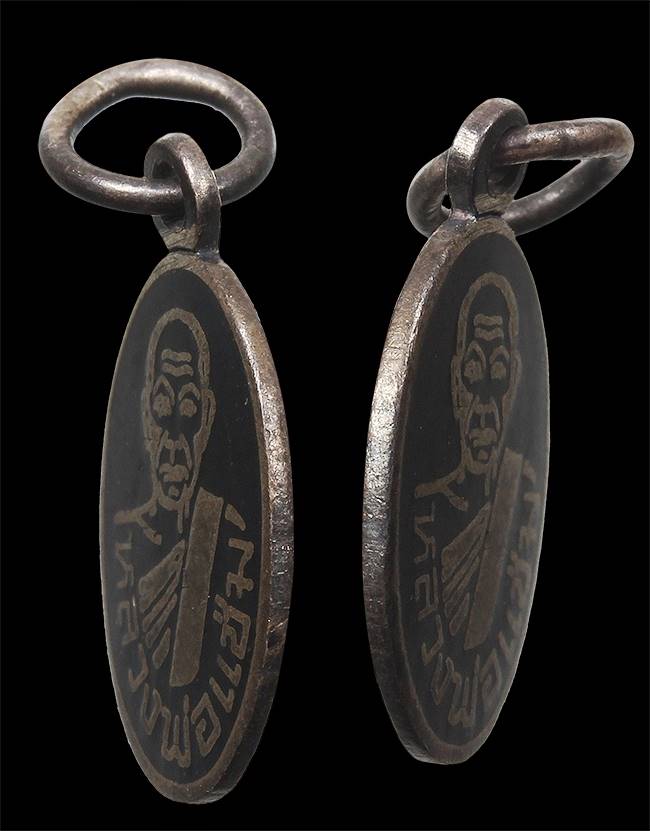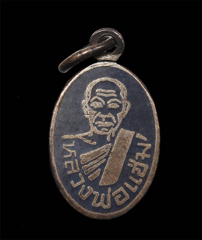 เหรียญเม็ดแตง หลวงพ่อแช่ม วัดฉลอง จ.ภูเก็ต ปี 12 เนื้อเงินลงถม ห่วงเชื่อม |