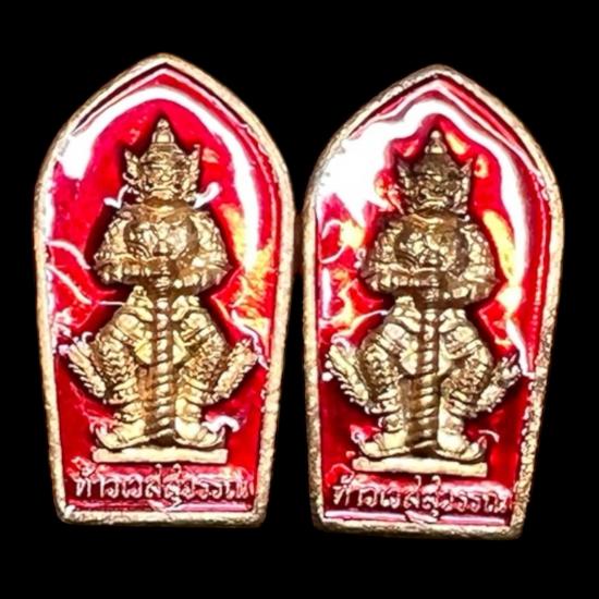 2องค์!! เหรียญปรกใบมะขาม เนื้อสัตตะ (ลงยาแดงใหม่) ท้าวเวสสุวรรณรุ่น4 ลาภผลพูนทวี มีทรัพย์เพิ่ม วัดจุฬามณี ปี 2563 |