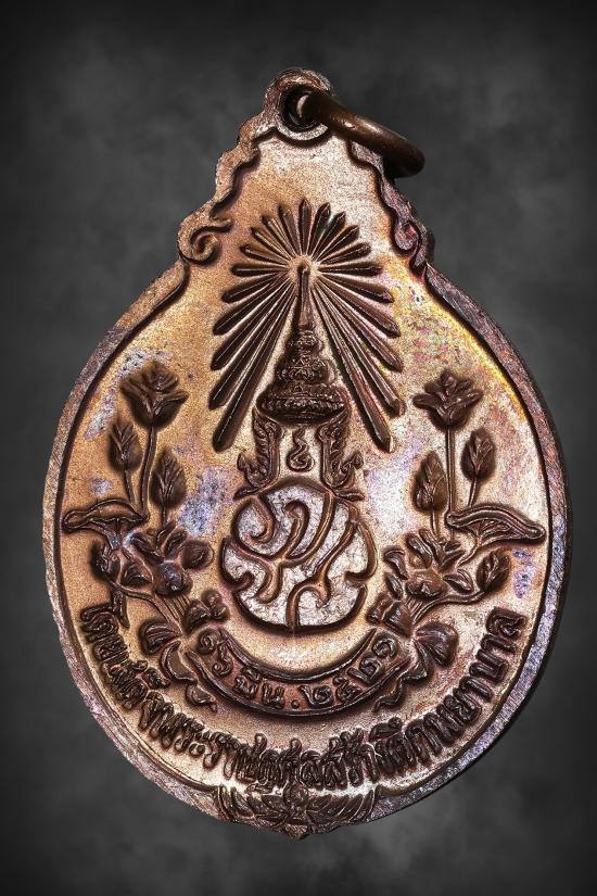 ด้านหลัง พระปรมาภิไธยย่อ ภปร. พระจุลมงกุฎเปล่งรัศมีอยู่เบื้องบน โดยเสด็จพระราชกุศลสร้างตึกพยาบาล ๑๖ มีนาคม ๒๕๒๑