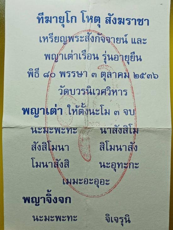 พญาเต่าเรือน รุ่นอายุยืน ฉลองพระชนมายุ ๘๐ พรรษา ๓ ตุลาคม ๒๕๓๖ เนื้อทองแดงผสมชนวนพระสังกัจจายน์ญส.ปี ๒๕๓๐ (พระสังกัจจายน์ญส.รุ่นแรก ปี ๒๕๓๐ เป็นรุ่นสำคัญมีส่วนผสมของชนวนพระกริ่งบวรรังสี ๒๕๒๘ และชนวนพระกริ่งปวเรศ ๒๕๓๐ ล้วน ๆ โดยไม่มีชนวนพระรุ่นอื่นเจือปนเลย) พิธีพุทธาภิเษก-ชัยมังคลาภิเษก ณ พระอุโบสถวัดบวรนิเวศวิหาร หลวงปู่หลิว ปณฺณโก วัดไร่แตงทอง เทพเจ้าแห่งพญาเต่าเรือน ร่วมปลุกเสกในพิธี หลวงพ่อเปิ่น หลวงพ่อแย้ม วัดสามง่าม หลวงพ่อพูล วัดไผ่ล้อม หลวงพ่อไสว วัดปรีดาราม หลวงพ่อแช่ม วัดดอนยายหอม หลวงพ่อยิด วัดหนองจอก หลวงพ่อสง่า วัดบ้านหม้อ ฯลฯ ร่วมพิธี เคาะเดียว พระมาพร้อมซองเดิม+ใบคาถาปั๊มตราญส.นาน ๆ เจอองค์ค่ะ