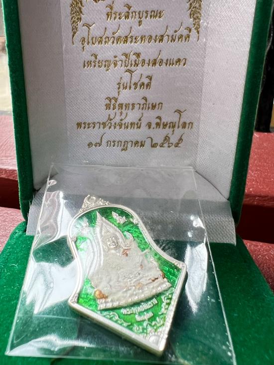 เริ่มเคาะแรก!! เหรียญจำปีสองแคว พระพุทธชินราชหลังท้าวเวสสุวรรณ รุ่น "โชคดี" เนื้อเงินนำฤกษ์ลงยาสีเขียวจีวรเหลือง หมายเลข 88 มหาละรวย (1 ใน 168 องค์) |