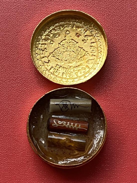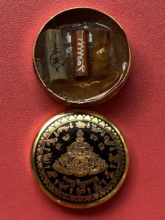 เคาะเดียวแดง สีผึ้งพระราหู รุ่น มงคลจักรวาล เนื้อ โลหะชุบทองลงยาสีดำขอบสีดำ ขนาด3.2ซม |