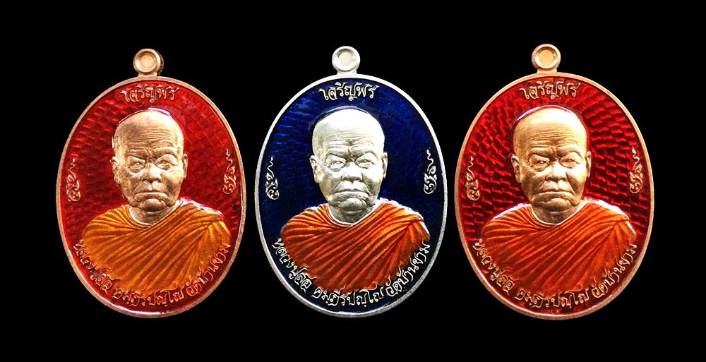 +!!เคาะเดียวllดง ตลอดสาย!!+ (รับชุด 3 เหรียญ) เหรียญเจริญพร หลวงปู่สอ วัดบ้านขาม จ.สุรินทร์ ปี2559 (เนื้ออัลปาก้าลงยาน้ำเงิน+ทองแดงลงยาแดง) เลขโค้ดสวยๆตามรูป พร้อมกล่องครับ