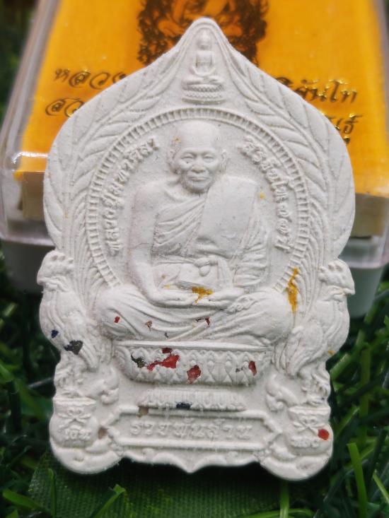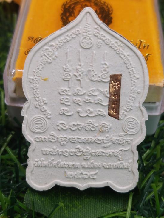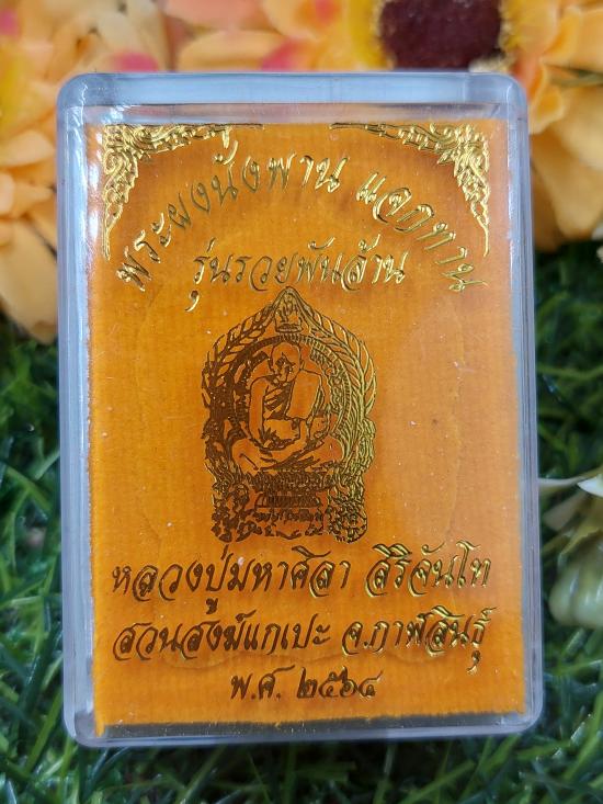 พระผงนั่งพาน รุ่นรวยพันล้าน หลวงปู่มหาศิลา สิริจันโท ยุคต้น 64 เนื้อขาวผงพุทธคุณฝังพลอยเสก no.129 |