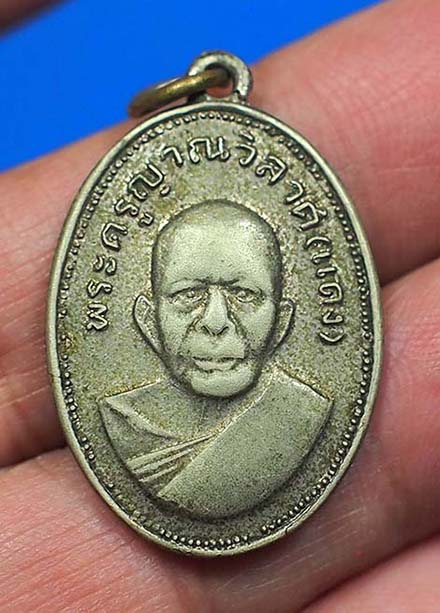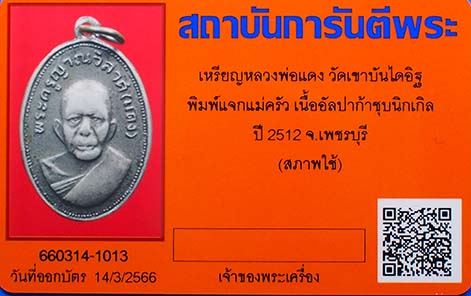 เหรียญหลวงพ่อแดง วัดเขาบันไดอิฐ พิมพ์แจกแม่ครัว เนื้ออัลปาก้าชุบนิกเกิ้ล ปี 2512 จ.เพชรบุรี พร้อมบัตรรับรองสถาบันการันตีพระ |