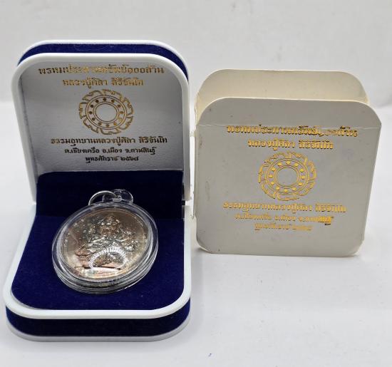 เหรียญ พรหมประทานทรัพย์๑๐๐ล้าน หลวงปู่มหาศิลา สิริจันโท ธรรมอุทยาน วัดพระธาตุหมื่นหิน จ.กาฬสินธุ์ เนื้อนวฤทธิ์ พลายเงิน เลข 931 เลี่ยมกันน้ำ มีกล่องเดิม |