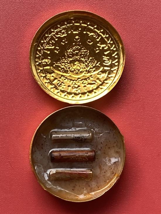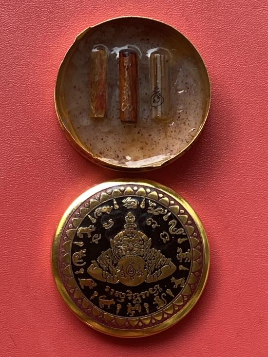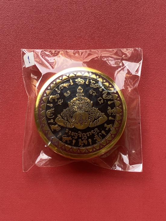 เคาะเดียวแดง สีผึ้งพระราหู รุ่น มงคลจักรวาล เนื้อ โลหะชุบทองลงยาสีดำขอบสีแดง ขนาด 5ซม |