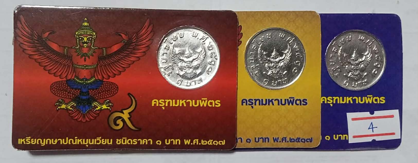 เหรียญ 1 บาท หลังพญาครุฑ เหรียญบาทประสบการณ์ พกติดตัวไว้เป็นมงคล เหรียญสภาพผ่านการใช้งานสวย พร้อมการ์ด สีแดง,สีน้ำเงิน,สีเหลือง จำนวน 3 เหรียญ ครับ #4#