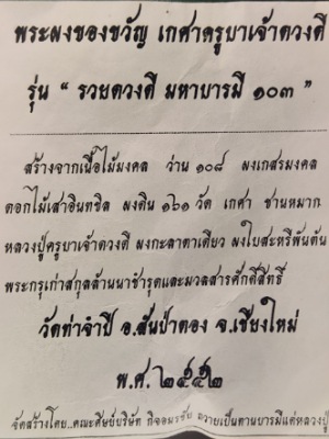 พระผงของขวัญ เกศาครูบาเจ้าดวงดี รุ่น รวยดวงดี มหาบารมี 103 สร้างจากเนื้อไม้มงคล ว่าน 108 ผงเกสรมงคล ดอกไม้เสาอินทขิล ผงดิน 161 วัด เกศา ชานหมาก หลวงปู่ครูบาเจ้าดวงดี ผงกะลาตาเดียว ผงใบสะหรี่พันต้น พระกรุเก่าสกุลล้านาชำรุดและมวลสารศักดิ์สืทธิ์ วัดท่าจำปี เชียงใหม่ 2552 |