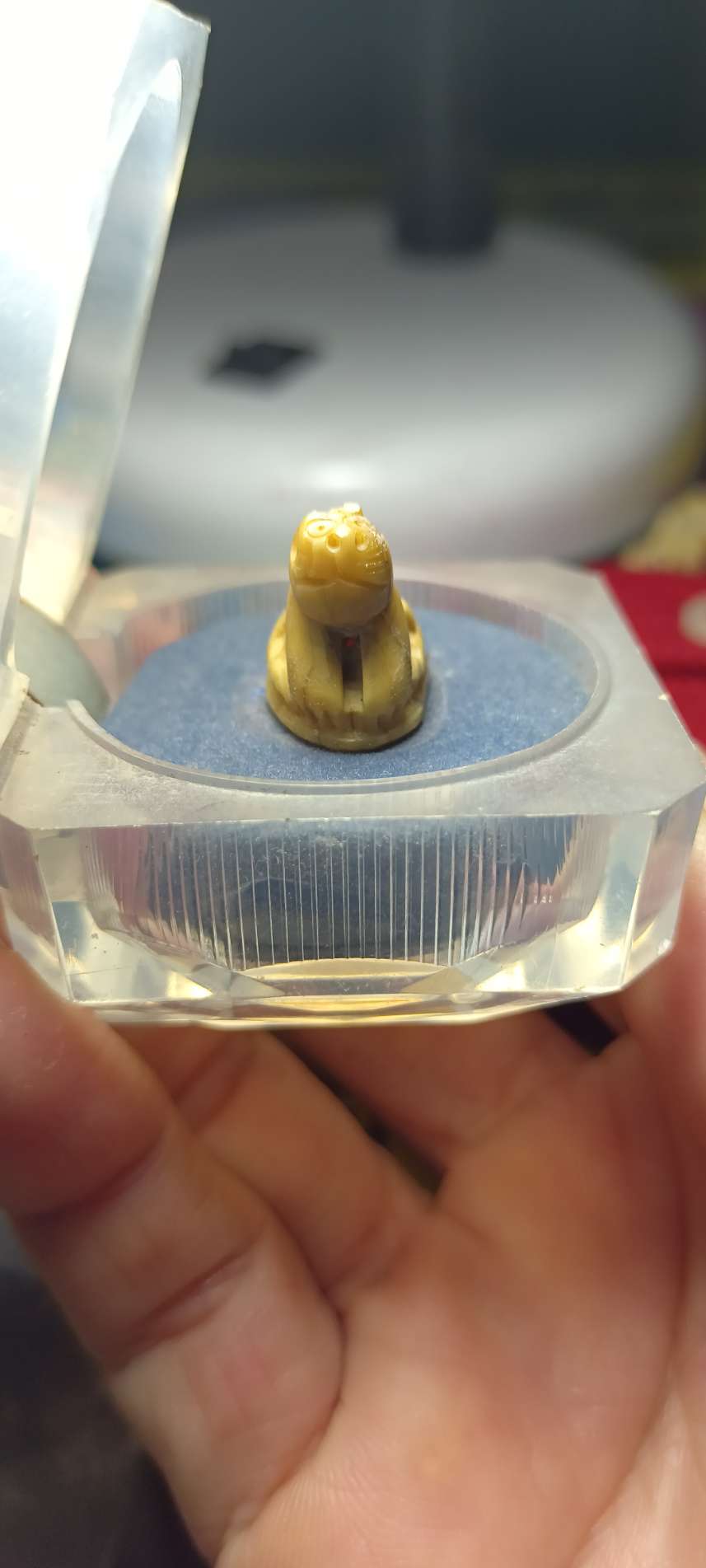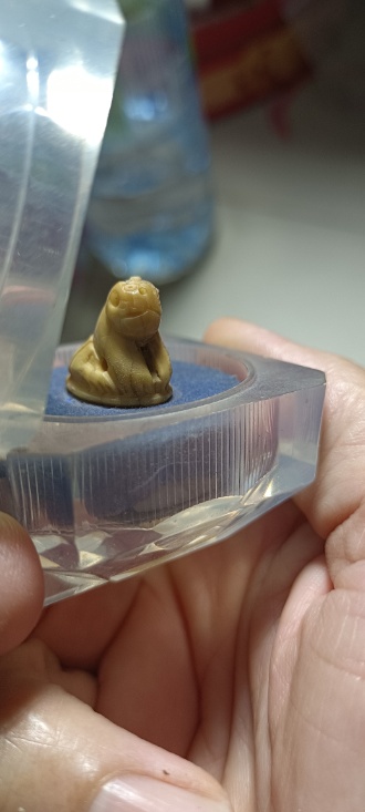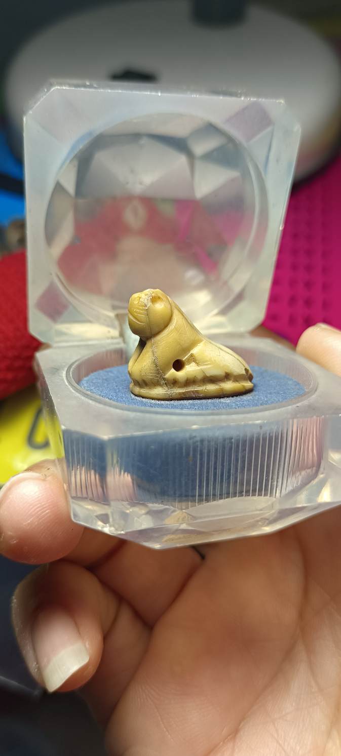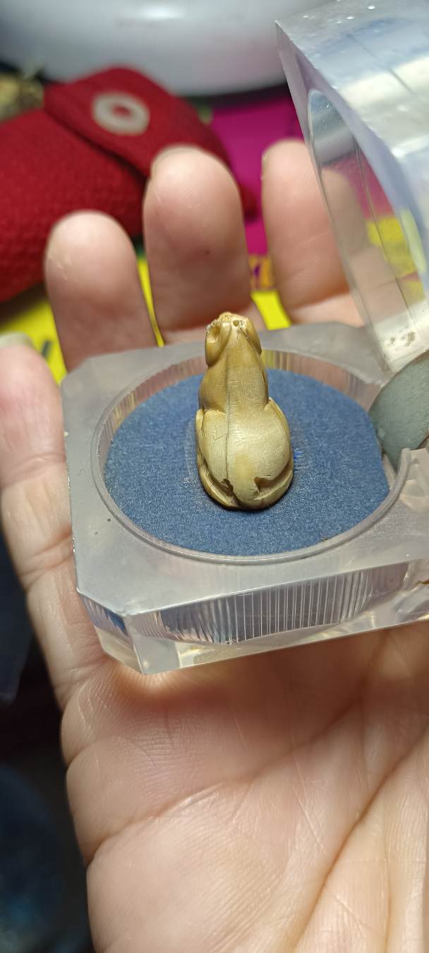 เสือแกะเก่า ในตลับตั้งหน้ารถไม่ทราบที่ สภาพเดิมๆ เจ้าของเดิมคงตั้งไว้หน้ารถเพราะใต้ตลับมีรอบกาวสองหน้า ได้มาจากตลาดนัดพระเหมา เอามาให้พี่ไปได้เคาะกัน เนื้อหาแห่ง เหลืองธรรมชาติ ศิลปะน่ารัก ไม่ทราบที่สร้าง ใครดูศิลป์ ออกเคาะเดียวแดงครับ |