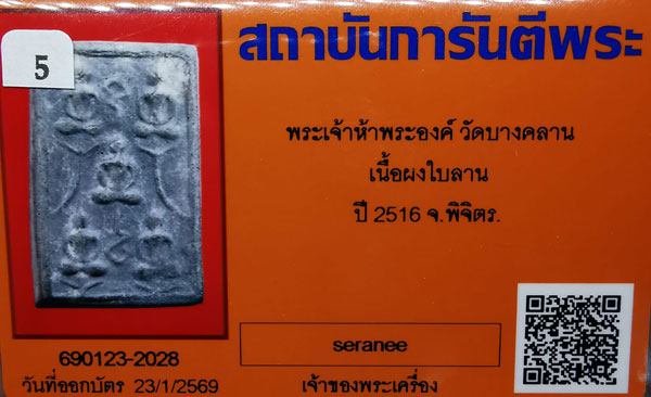 พระเจ้าห้าพระองค์ วัดบางคลาน เนื้อผงใบลาน ปี2516 จ.พิจิตร + บัตรG-pra สภาพเดิมค่ะ |