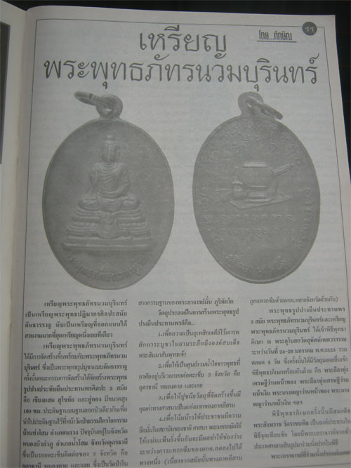 เหรียญพระพุทธภัทรนวมบุรินทร์ที่จัดสร้างในครั้งนั้น มีด้วยกัน 3 ชนิด เหรียญทองคำสร้าง 10 เหรียญ บูชาเหรียญละ 3900 ปรากฎว่ามีคนจองหมดทุกเหรียญตั้งแต่ถึงวันพิธีพุทธาพิเสก เหรียญนวโลหะสร้าง 999 เหรียญ บูชาเหรียญละ 99 บาท เหรียญทองแดงสร้าง 52,523 เหรียญ บูชาเหรียญล่ะ 99 บาท แม้เหรียญทองแดงจะสร้างจำนวนมากและราคาทำบุญในตอนนั้นค่อนข้างถูก แต่ก้อมีคนจองล่วงหน้ากันมากคนละหลายๆเหรียญ ครั้นเมื่อเสร็จพิธีก้อมีคนเช่ามากเหมือนเดิม บางคนเช่าคนเดียวก้อหลายสิบเหรียญ เพราะทราบกันดีว่าเหรียญทองแดงสร้างจากโหละศักดิ์สิทธิ์ ทั้งชนวนพระเครื่องเก่าๆหลายสิบรุ่น ตะกรุดและแผ่นยันต์จากเถราจารย์ทั่วประเทศนับเป็นพันดอกพันแผ่น ซึ่งไม่ต้องพูดพิธีและเถราจารย์ที่มาร่วมพิธี แค่ชนวนโลหะที่นำมาสร้างเหรียญก็มีคุณค่ายิ่งเป็นที่สุด |